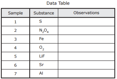 Some students are using samples of different substances for a lab investigation. They plan to observe the physical properties of each substance and record their observations in a table like the one below.