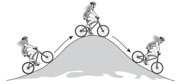 A bicycle rider is traveling up a hill. When the rider reaches the top of the hill, she stops to rest. Then she travels down the hill. The diagram shows the rider in the three different positions.