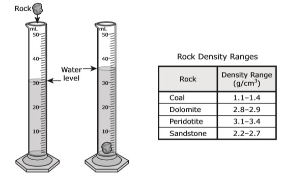 The mass of an unidentified rock is 15.5 grams. Students determine the volume of the rock by placing the rock in a cylinder with water. The students calculate the density of the rock. They determine the identity of the rock based on the density ranges in the table.