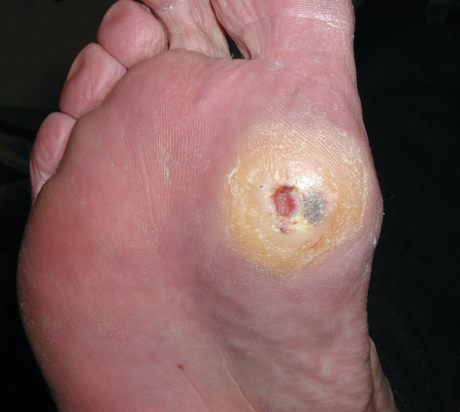 A 40-year-old man is evaluated for a painless foot ulcer (shown). He has diabetes mellitus.