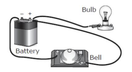 Starts as chemical energy in the battery--> transforms to electrical energy in the wires --> transforms to light energy at the light bulbs --> transforms to sound energy at the bell