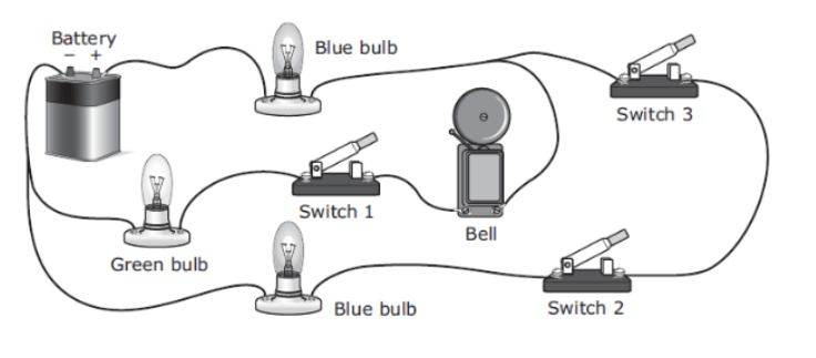 If switch 1 and switch 3 are closed and switch 2 is open, what loads on the circuit will be working?