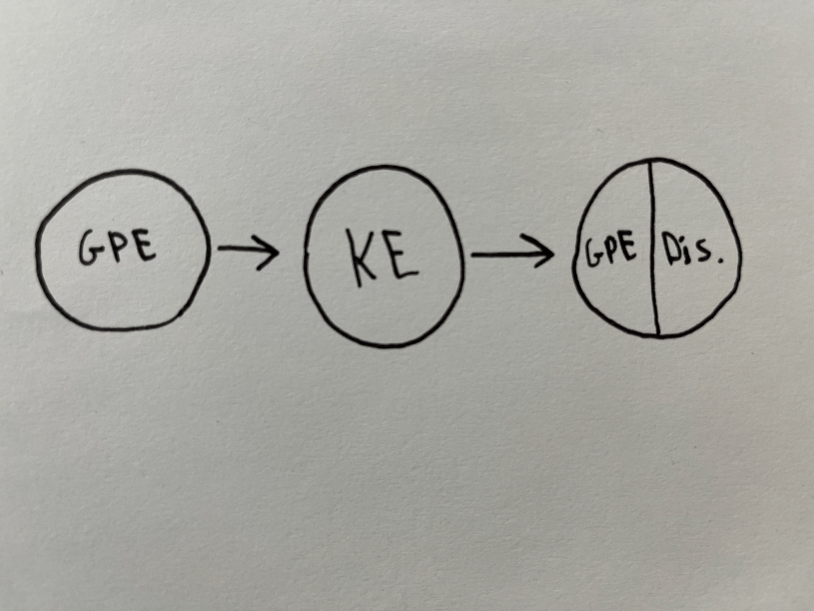 A 50-kg crate that is falling has a terminal velocity of 40 m/s at an altitude of 100 m above the ground. Which is larger, the crate's Kinetic Energy or its Gravitational Potential Energy? Assume g = 9.8 m/s^2