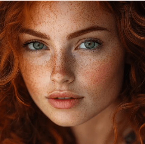 She¿s got fair skin, big green eyes. She's got long wavy red hair. She's got freckles.