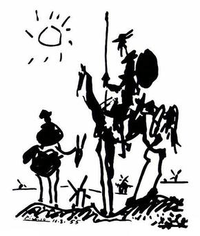 Here is a Pablo Picasso sketch of this literary hero. Note the figures in the background.