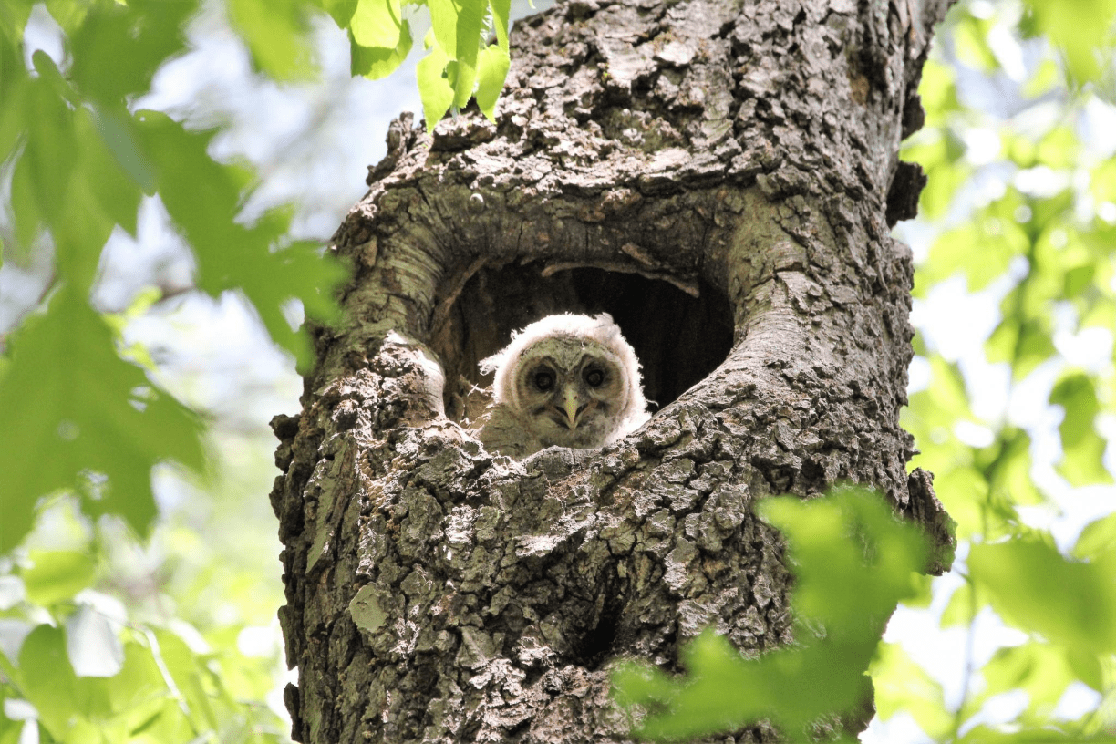 An owl nesting in upper parts of trees is what kind of adaptation? What does it help them achieve?
