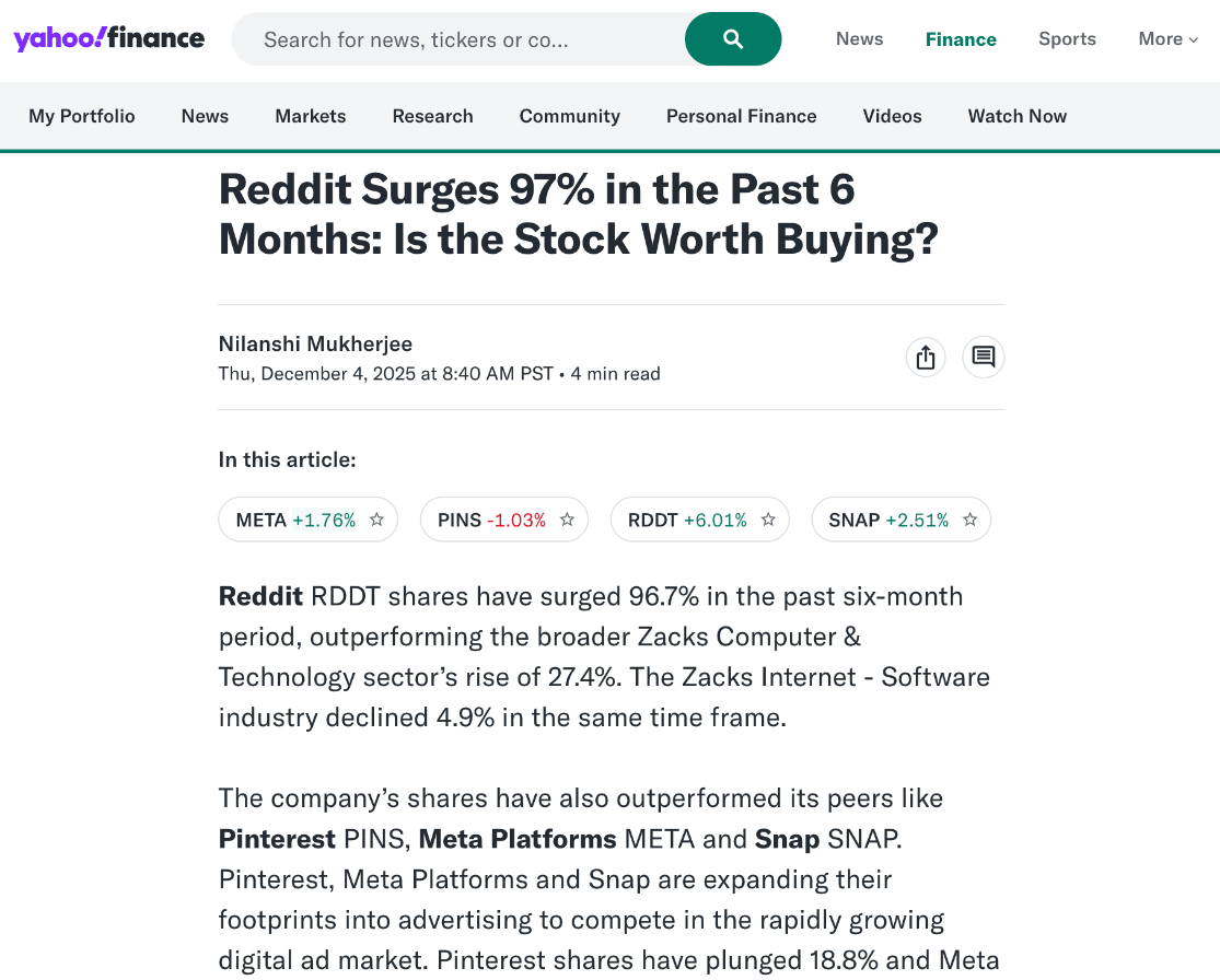 The percentage RDDT has surged in the last 6 months, according to recent headlines (12/4/25).
