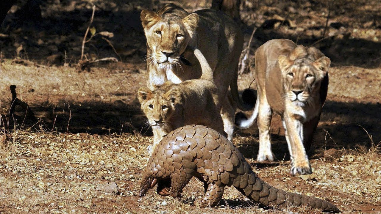 This pangolin is about to be attacked by lions. What is the adaptation. How does it help?