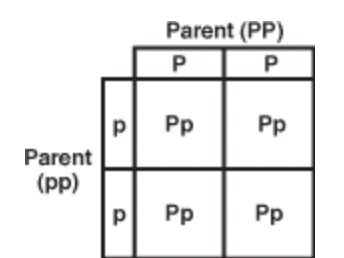 In a certain species of plant, the color purple (P) is dominant to the color white (p). According to the Punnett Square, what is the probability of an offspring being white?