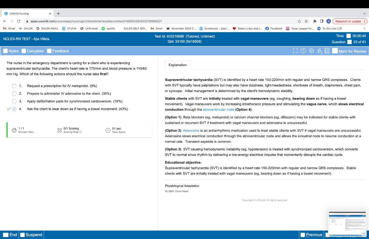 the nurse in the emergency department is caring for a client who is experiencing supraventricular tachycardia. The clients heart rate is 170 / min and blood pressure is 110/60 mm Hg. Which of the following actions should the nurse take first ?