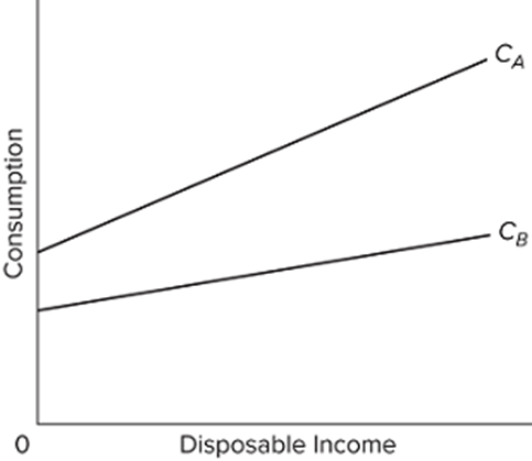 Refer to the given diagram, which shows consumption schedules for economies A and B. We can say that the