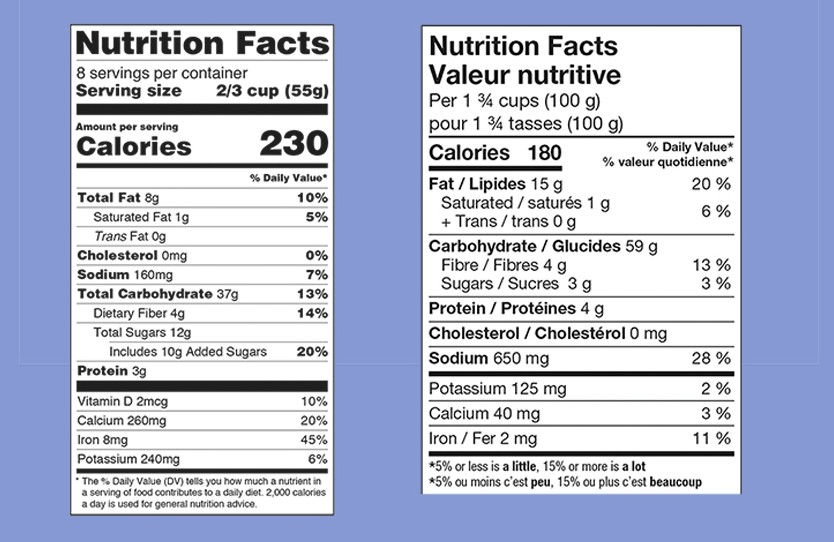 The one on the right, bilingual, no servings per container, Vitamin D included in the essential nutrients