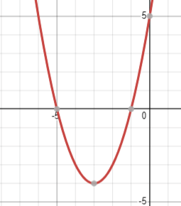 Graph with a vertex at (-3,-4) and goes through (-5,0), (-1,0), (5,0),(-6,5)