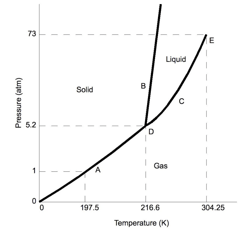 A sample of carbon dioxide starts off at 300 K and 1 atm. It is heated up to 305 K and 73 atm. What state of matter describes the carbon dioxide at the second pressure and temperature?