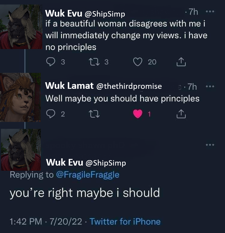 We encounter this green-haired Roegadyn early into our journey. He gave us some encouragement before getting pancaked in the Copperbell Mines along with the rest of his party.