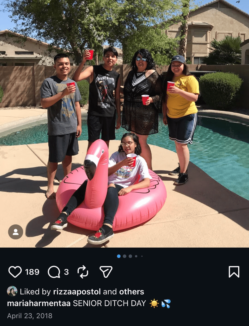 In 2018, _______ is sitting on a pink flamingo pool floatie surrounded by 4 of their friends in a tagged post captioned, "SENIOR DITCH DAY ☀️💦".