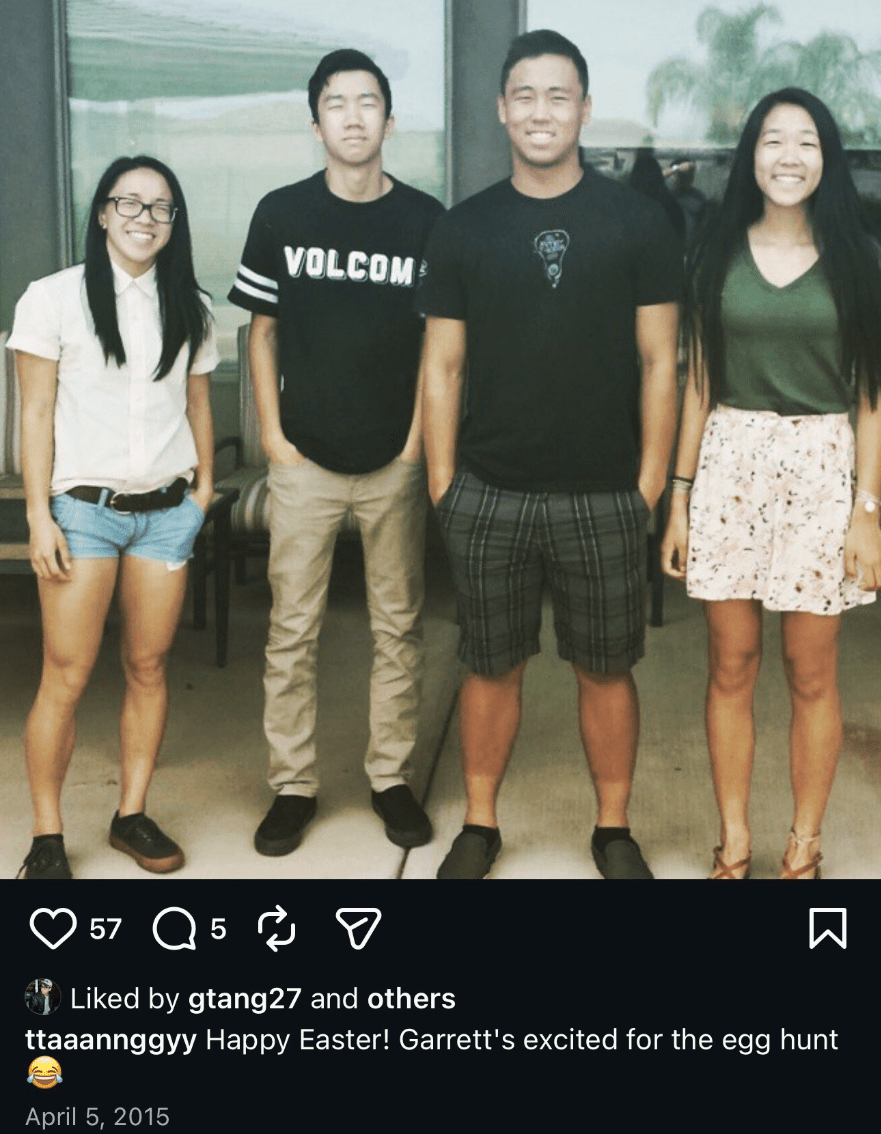 In 2015, this person was tagged in a post captioned, "Happy Easter! _______'s excited for the egg hunt 😂". Although, this person is the only one not smiling in the picture amongst 3 others who are.
