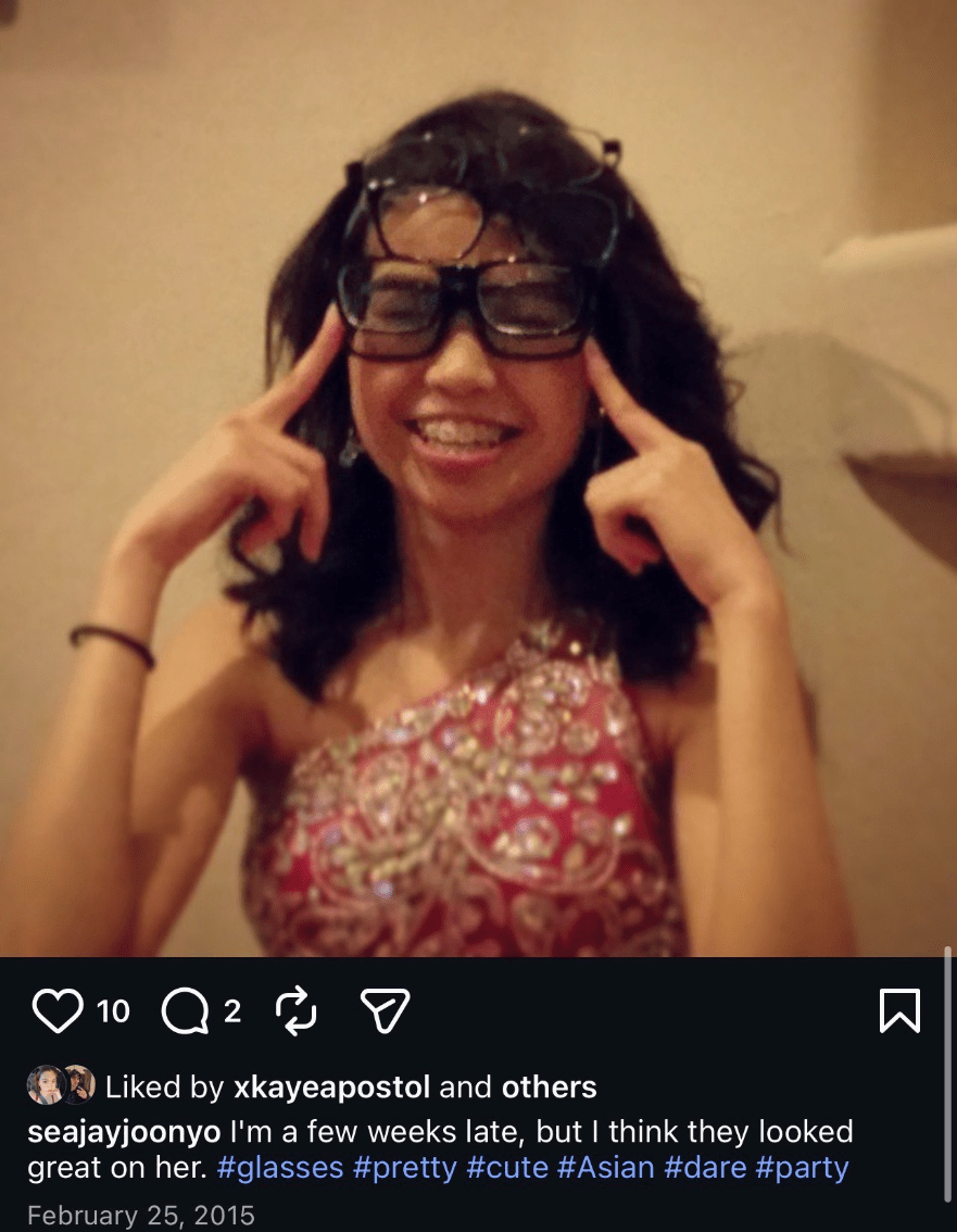 in 2015, _______ is seen wearing an absurd number of glasses on his/her face in a tagged post captioned, "I'm a few weeks late, but I think they looked great on him/her. #glasses #pretty #cute #Asian #date #party".