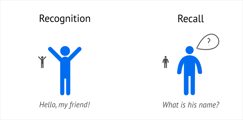 Recognition: Memory is prompted via retrieval cues, multiple-choice test