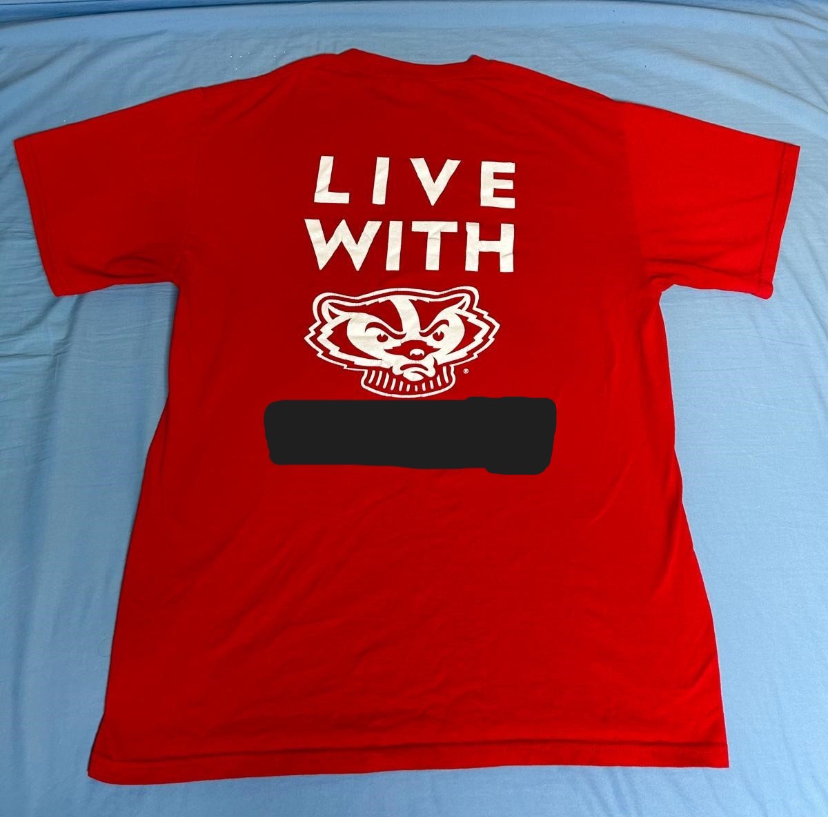 Here is the back of the house fellow shirt. Part of the shirt is censored. Tell us the exact words that are hidden by the black box.