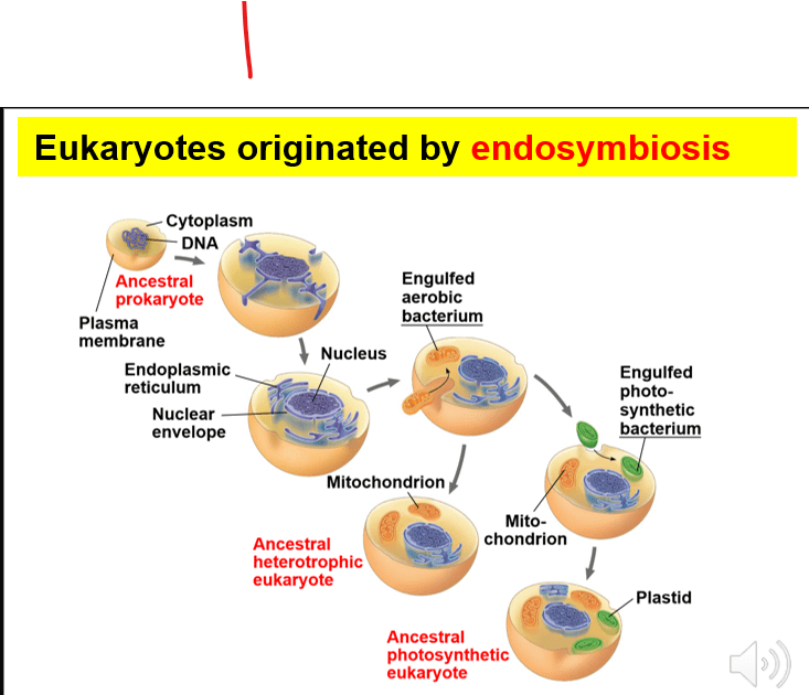 1. Ancestral prokaryote's plasma membrane began to fold inwards producing a nucleus and ER region.