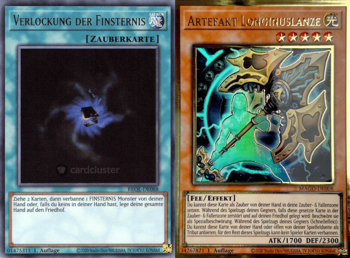 Longinuslanze verhindert, dass Karten verbannt werden können. Durch 'Verlockung der Finsternis' zieht Spieler A 2 Karten und muss dann, weil er nichts verbannen kann, 1 Finsternis-Monster aus seiner Hand vorzeigen, um zu beweisen, dass er eins verbannen KÖNNTE. Andernfalls wirft er seine Hand ab.