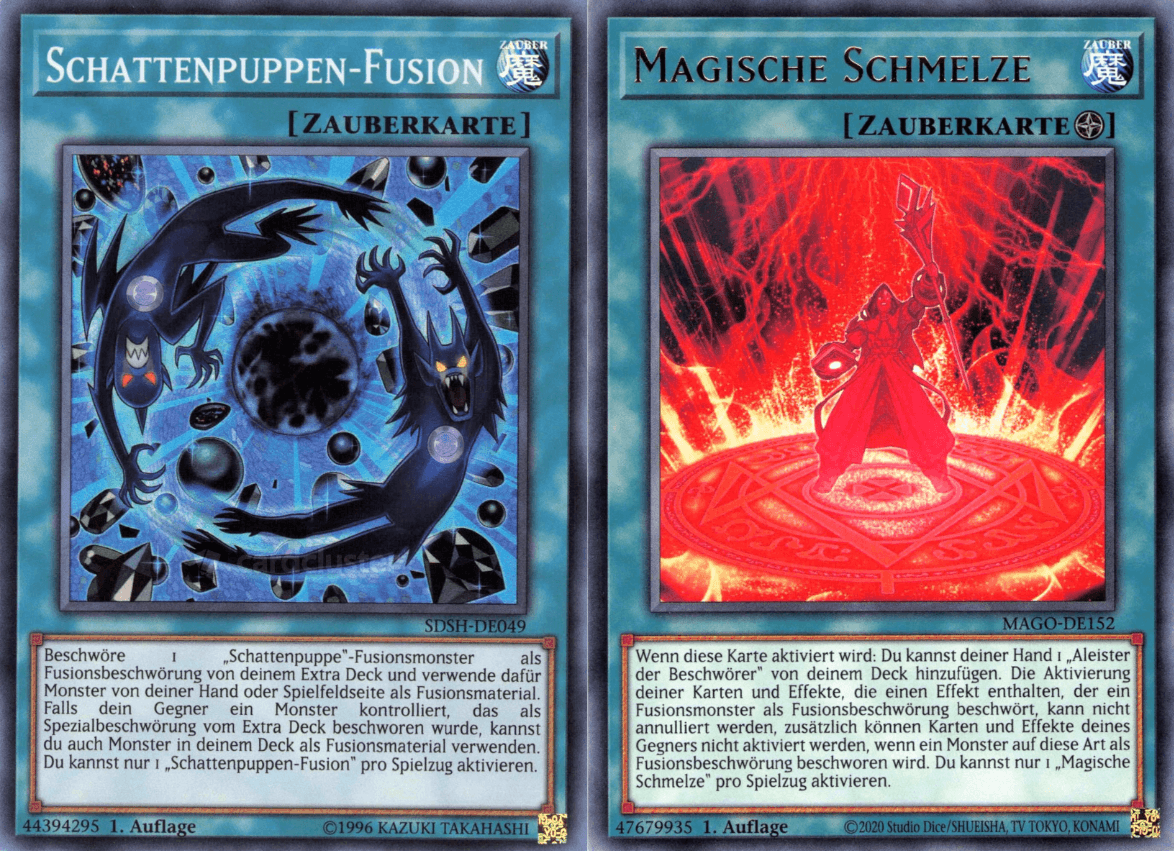 Spieler B aktiviert 'Schattenpuppen-Fusion' und legt z.B. 'Schattenpuppe Drache' und 'Schattenpuppe Squamata' vom Deck auf den Friedhof um 'El Schattenpuppe Winda' zu beschwören. Nach Ruling des Head-Judges durfte Spieler B nun nicht seine Schattenpuppen-Trigger-Effekte im Friedhof verwenden, aufgrund des Effekts von 'Magische Schmelze' "[...]zusätzlich können Karten und Effekte deines Gegners nicht aktiviert werden, wenn ein Monster auf diese Art als Fusionsbeschwörung beschworen wird."