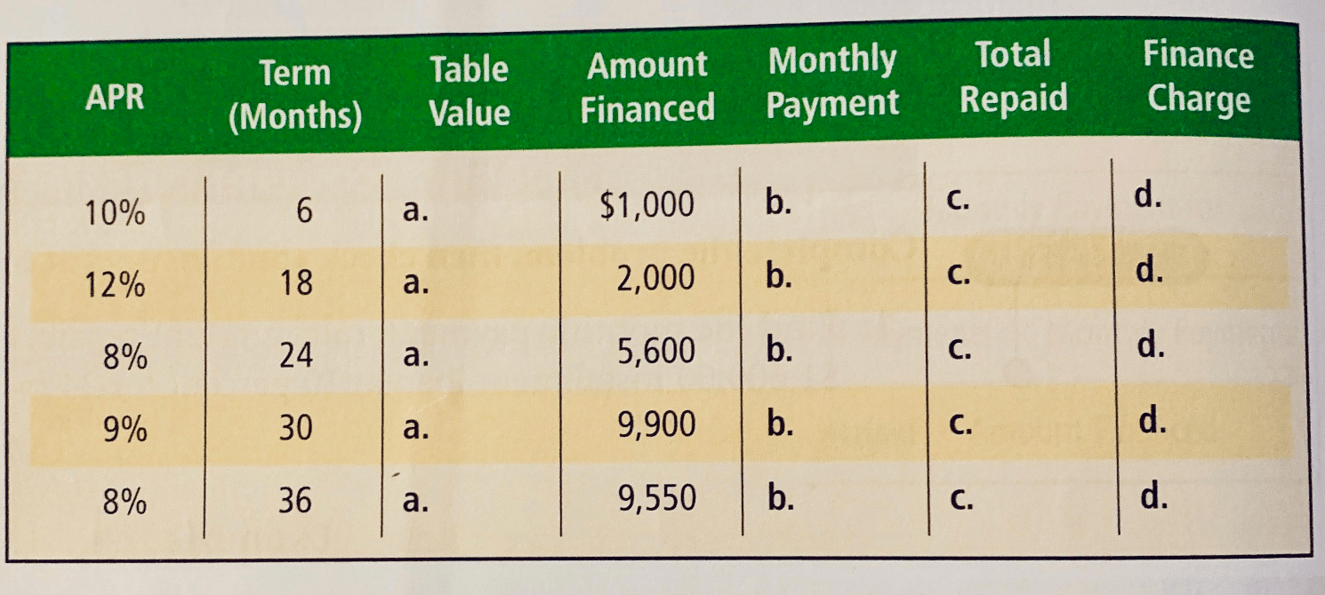 Find the a. table value, b. monthly payment, c. total repayment, and d. finance charge.