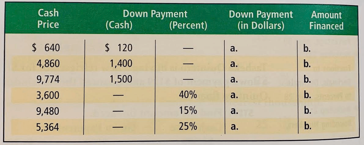 Using the given cash price of $640, find the a. down payment and b. the amount financed.