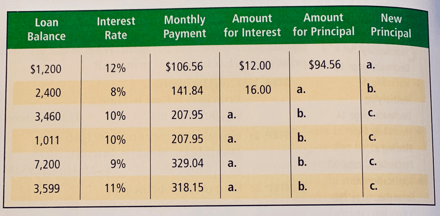 For the loan balance of $7,200, find a. amount for interest, b. amount for principal, and c. new principal