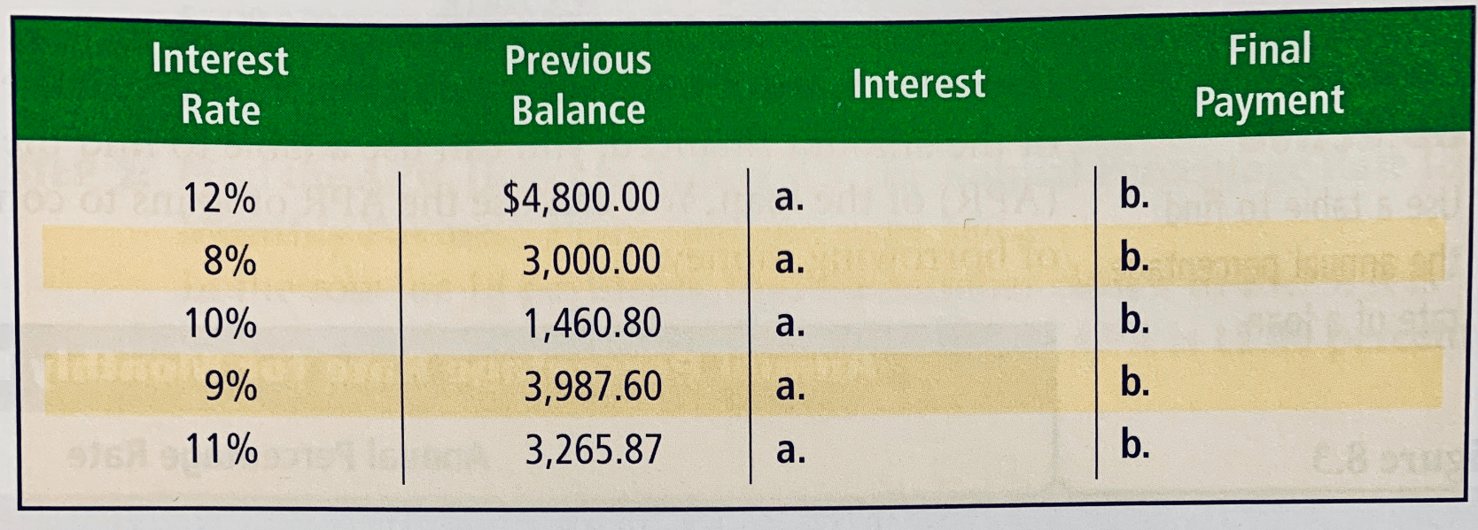 For the loan balance of $3,460, find a. amount for interest, b. amount for principal, and c. new principal