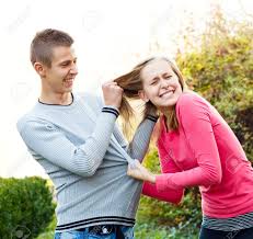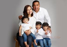How are the woman in purple, the woman in the pink and white top, and the man with the white top and mustache related?