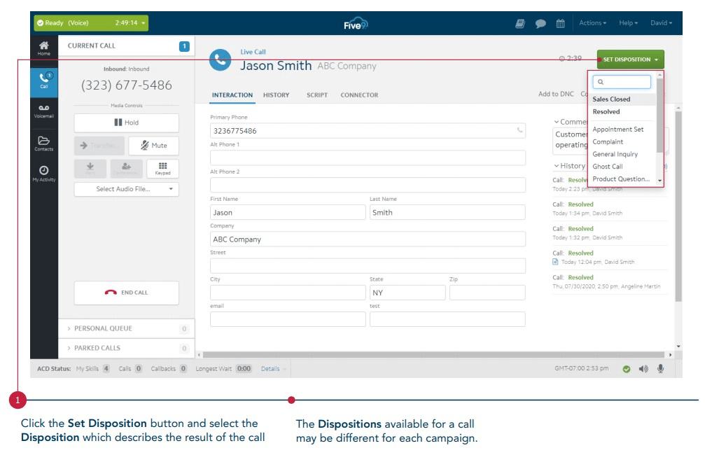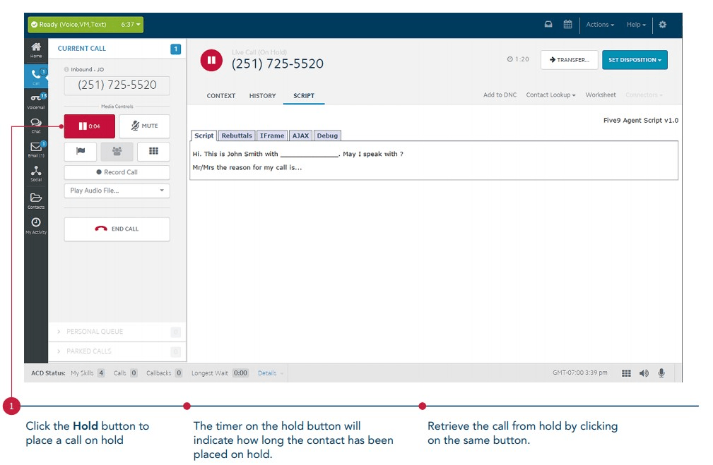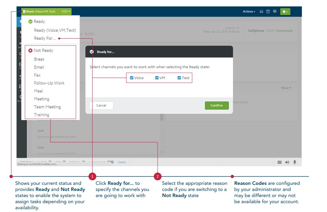 This shows your current status in Five9 and dictates your ability to take calls in the queue