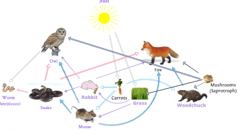 The mushroom is a decomposer which means it "eats" or breaks down the other organisms for energy. So the arrows should be facing toward the mushroom.