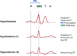 What is ST segment depression, flat or inverted T waves (or both), elevated U wave, prolonged QRS intervals, heart block, ventricular dysrhythmias