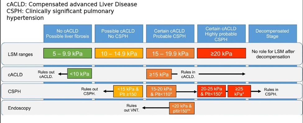 With liver stiffness measurement by transient elastography, which cutoff correlates with probable CSPH?