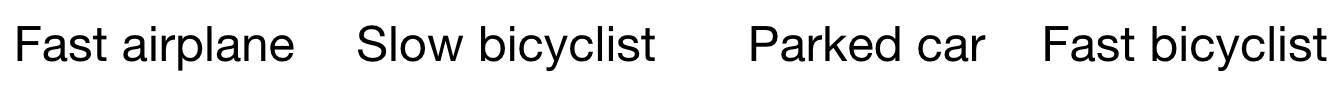 Fast airplane, fast bicyclist, slow bicyclist, parked car