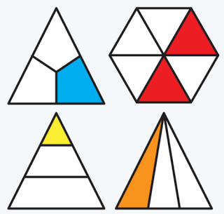 Bottom Left: This one does not belong because it is not a fraction. It does not separate the triangle into equal parts, and the shapes pieces are all different shapes.