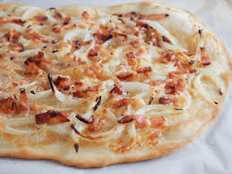 Which Alsatian dish looks like a pizza with cheese, onions, and bacon?