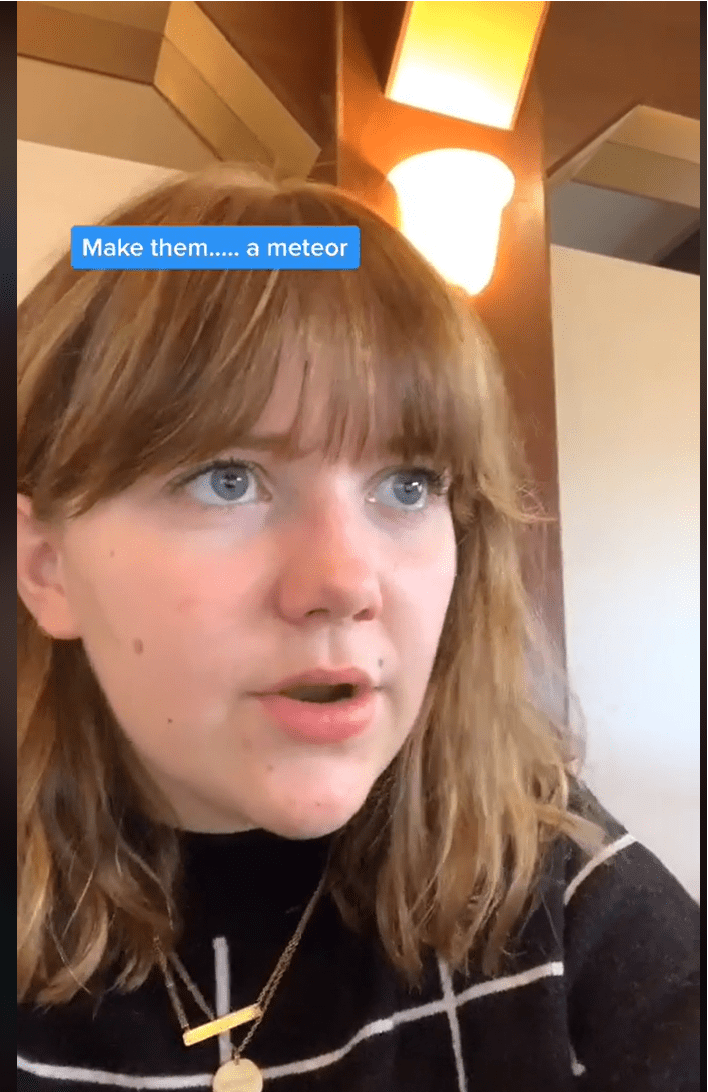 According to this tik toker, an angel accidentally took out the dinosaurs when God actually asked her to make the dinosaurs ______.