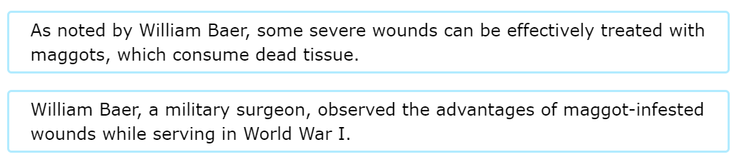 While serving in World War I, surgeon William Baer noticed something curious: soldiers whose wounds were infested with maggots (the wormlike immature larval form of flies) recovered faster than those whose wounds were maggot-free. Although Baer was not the first military doctor to take note of this phenomenon, he was the first to apply his observations to the problem of nonhealing wounds. In the 1920s, he began treating hospital patients' serious wounds with maggots. The maggots consumed dead tissue, effectively cleaning the wounds and helping the patients heal. While maggot therapy fell out of favor after bacteria-killing antibiotic medications were introduced, it has made a comeback in modern medicine. Many clinicians have found that the treatment can be effective for certain types of severe wounds that do not respond to antibiotics.