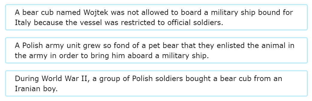 While traveling through Iran during World War II, a group of Polish soldiers encountered a young boy with an intriguing possession available for trade: a bear cub. The soldiers promptly bought the cub, named him Wojtek, and took him to join the rest of their unit. The playful bear adapted well to military life. However, when the unit was sailing for Italy, officials refused to allow the bear on the ship, saying that only soldiers were permitted. The solution was both obvious and extraordinary: the soldiers arranged for Wojtek to be officially enlisted in the army. As an enlisted soldier, he could accompany the men on their mission. "He didn't receive money," recalled one former soldier in an interview with the BBC World Service, "but was officially a Polish soldier." Wojtek remained with the company throughout the war and even helped carry heavy crates of ammunition to soldiers on the battlefield.