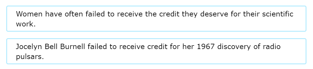 Historically, men have dominated the field of science, and many women have not received professional credit or public recognition for their work. Rosalind Franklin, for example, was a chemist who did groundbreaking research into the structure of DNA, a type of molecule in cells that helps control their growth, activity, and reproduction. Franklin's X-ray photograph of DNA was shared, without her knowledge, with biologist James Watson. Franklin's work helped Watson and fellow researcher Francis Crick discover the structure of DNA, but she received no credit when they won a Nobel Prize for their model of DNA in 1962. Another scientist denied credit for her work was Jocelyn Bell Burnell. Bell Burnell was a postgraduate student in 1967 when she discovered the first radio pulsars—small, dense rotating stars that emit radio waves. However, the credit was given to her supervisor, Antony Hewish, who received a Nobel Prize in 1974.
