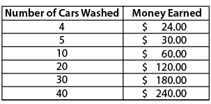 This table below shows the relationship between cars washed and money earned at a fundraising event.