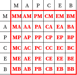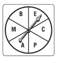 The spinner shown is spun twice and the pairs are recorded. What is the probability of rolling an M and a P (in any order)?