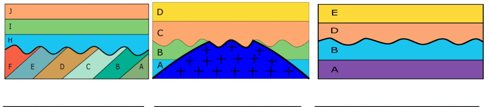 Identify the following unconformities (only 1 of each): angular unconformity, disconformity, nonconformity