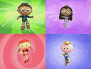 These four main characters star in the kids show Super Why, a show about teaching kids about reading, language, and spelling by diving into books and stories.