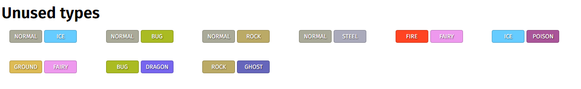 What is Normal/Ice, Normal/Bug, Normal/Rock, Normal/Steel, Fire/Fairy, Ice/Poison, Ground/Fairy, Bug/Dragon and Rock/Ghost.