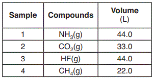 The volumes of four samples of gaseous compounds at 298 K and 101.3 kPa are shown in the table below.