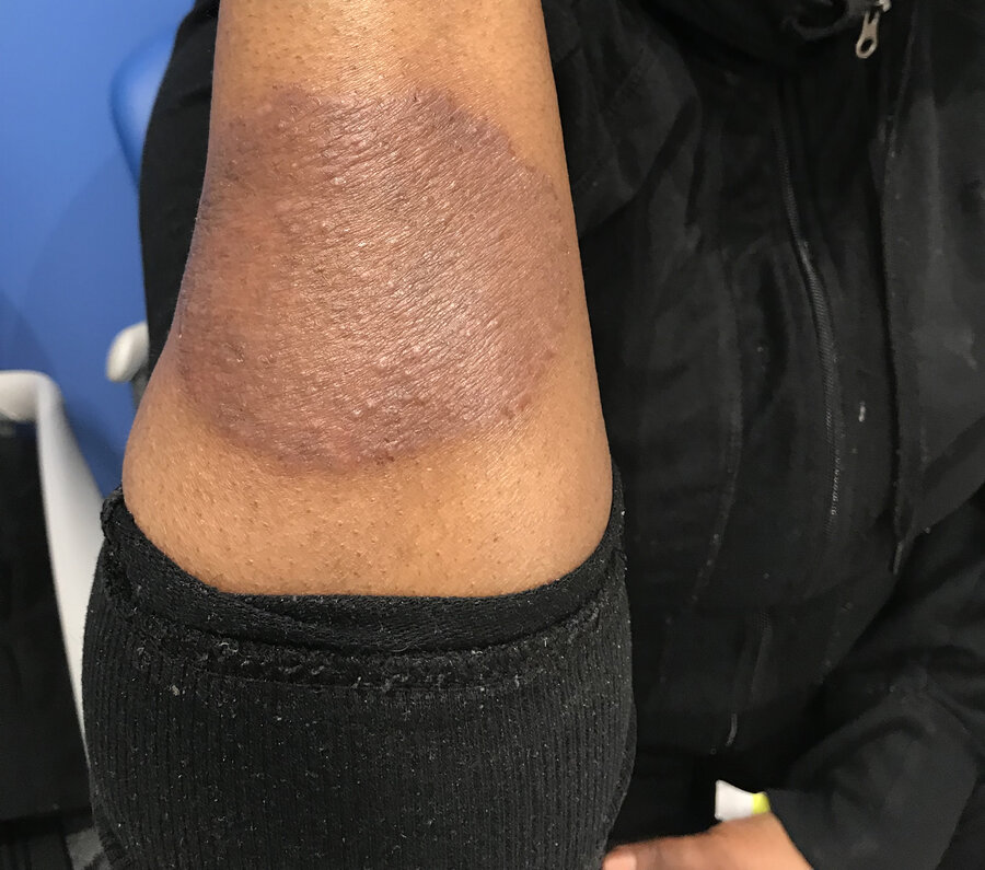 41 yo woman is evaluated for an expanding slightly pruritic rash with scaling as shown below